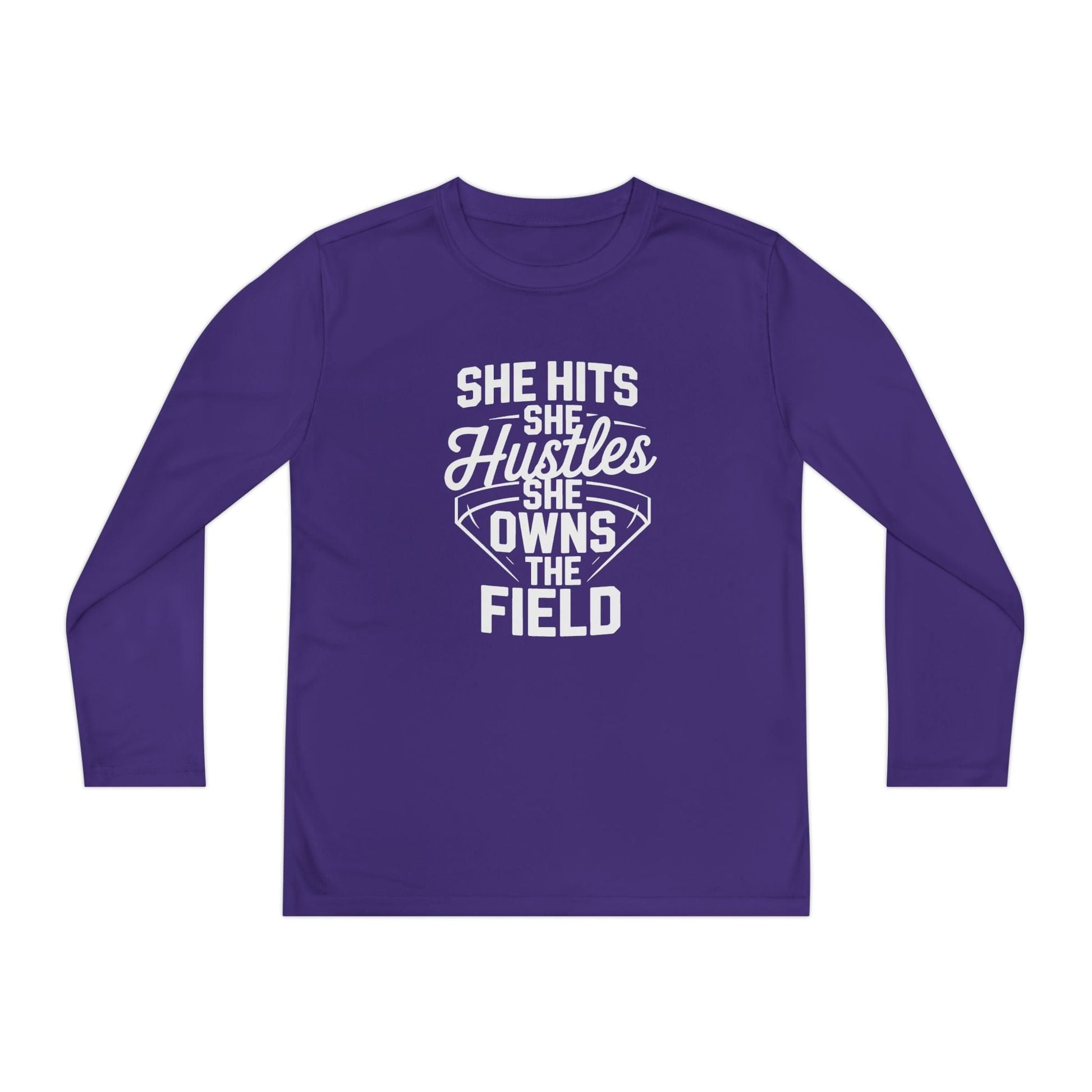 She Hits She Hustles She Owns the Field Youth Long Sleeve Competitor Tee